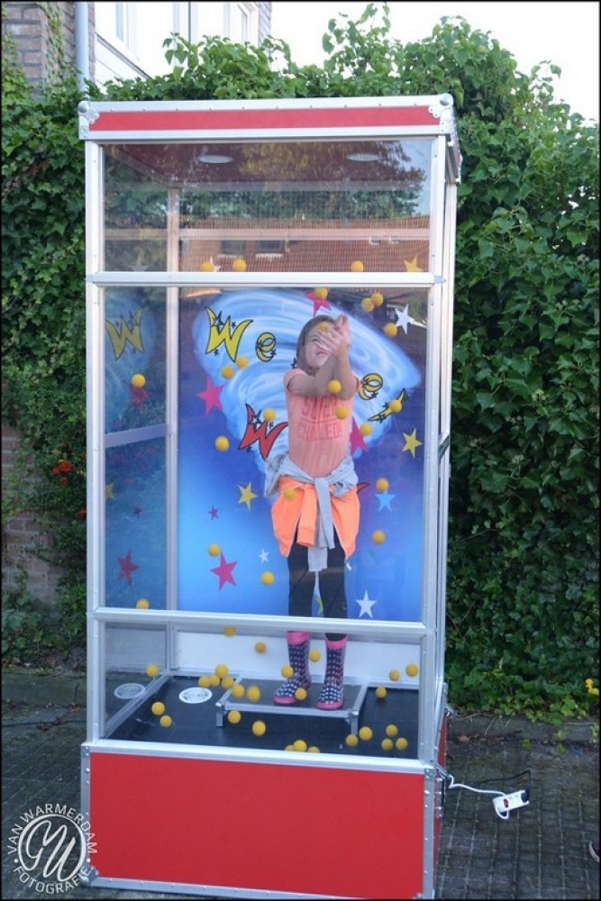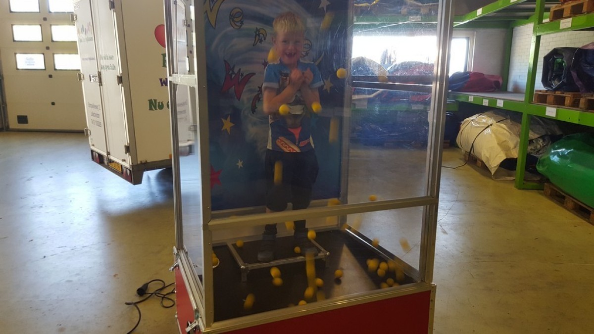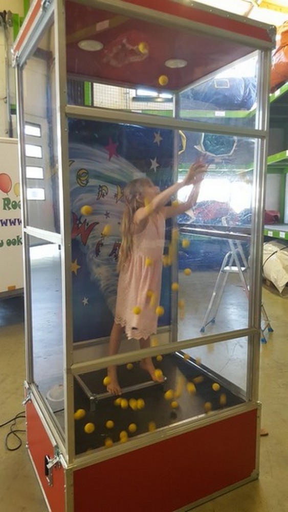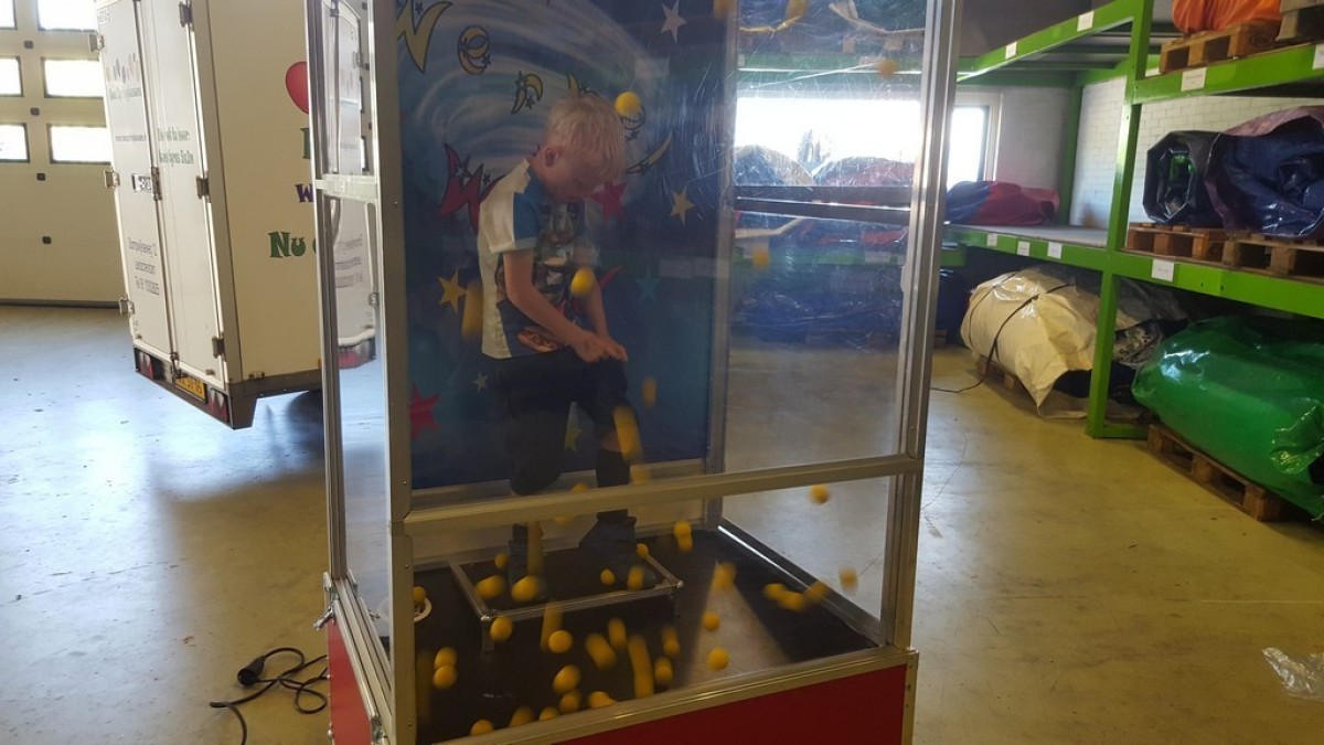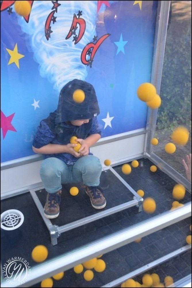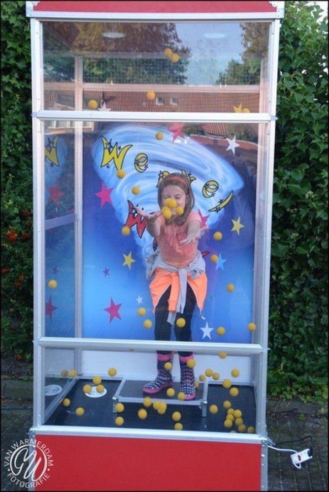 Kassa! Neem plaats op het plateau in de cabine en vang zo veel mogelijk balletjes die door de wervelwind omhoog worden geblazen. Het is nog niet zo makkelijk als het lijkt.