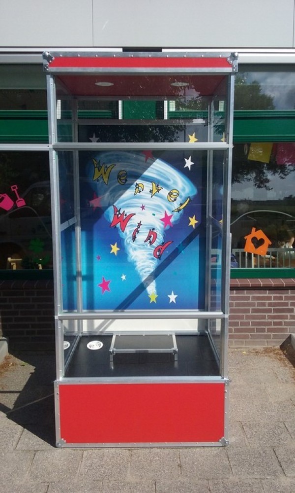 Tegen de achterwand bevindt zich een plaat met een wervelwind. Uiteraard bent u vrij deze ruimte te gebruiken voor het aanbrengen van uw eigen opdruk of logo, mits deze weer volledig is verwijderd (zonder het achterlaten van (lijm)resten en/of beschadigingen) wanneer de cabine weer retour komt.