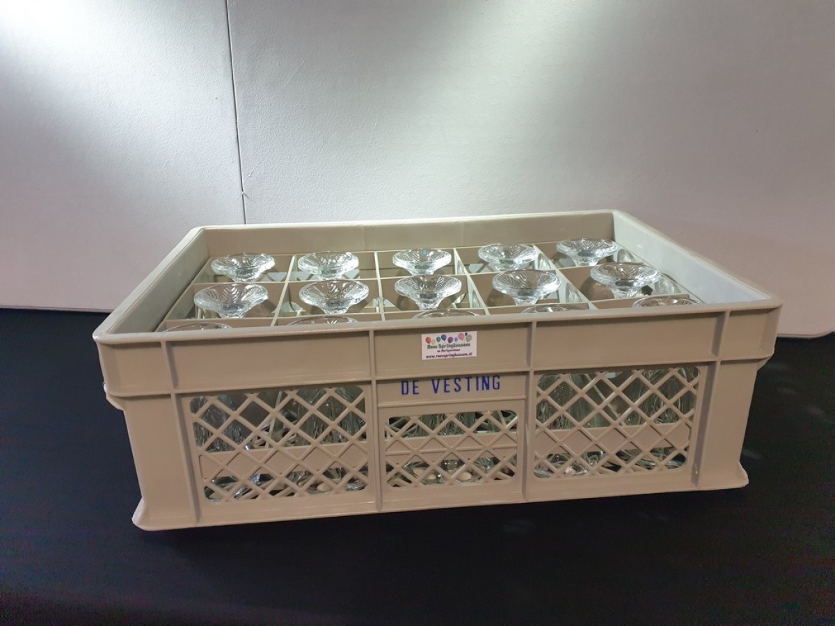Het glaswerk wordt standaard geleverd in korven met vaste aantallen. Helaas kan er niet worden afgeweken van deze aangeboden hoeveelheden en leveren wij alleen per volle korf.