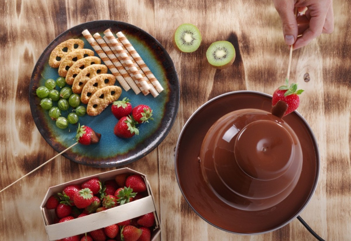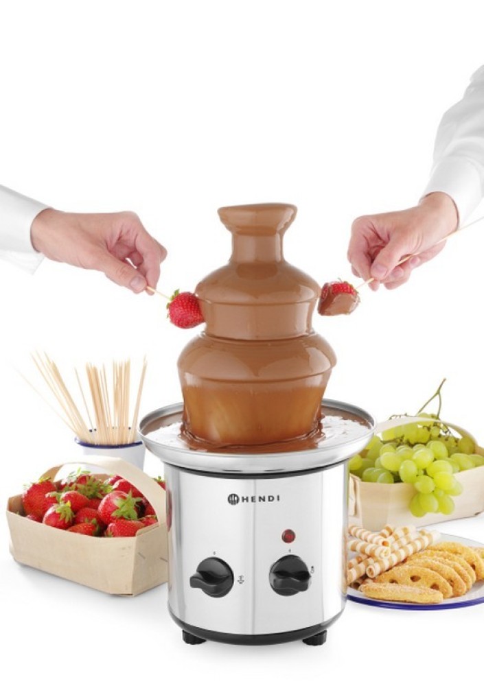 Aardbeien, ananas, banaan, mandarijn, meloen, druiven appels en peren. Of dip een heerlijke zoete versnapering onder in de chocolade: lange vingers, stroopwafels, poffertjes, fudge, marsmallows, wafels, slagroomsoesjes of bijvoorbeeld ijsrolletjes! Deze chocoladefontein is een ware hit op ieder feest. Denk eens aan de grote ogen van de kinderen op een kinderfeestje, de luxe uitstraling op uw buffettafel of bij het dessert. Jong en oud zal smullen van deze heerlijke lekkernij.