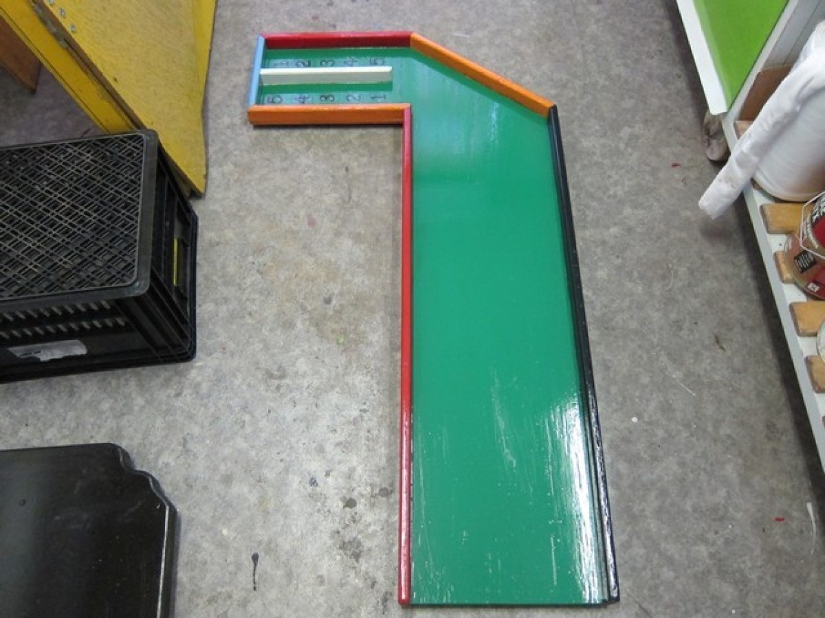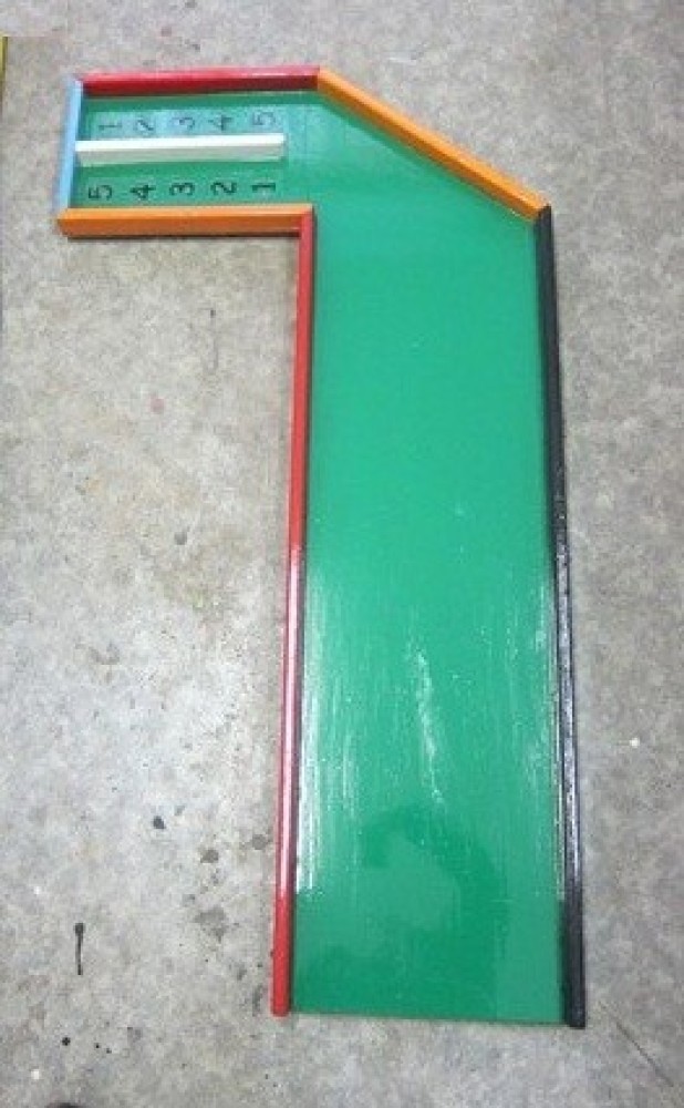 Dit is niet gewoon sjoelen, maar sjoelen met een hindernis. Op deze baan is het namelijk de bedoeling dat je om het hoekje sjoelt. De schijven komen aan het eind van het eerste stuk tegen de schuine kant aan en kaatsen af richting de poortjes!