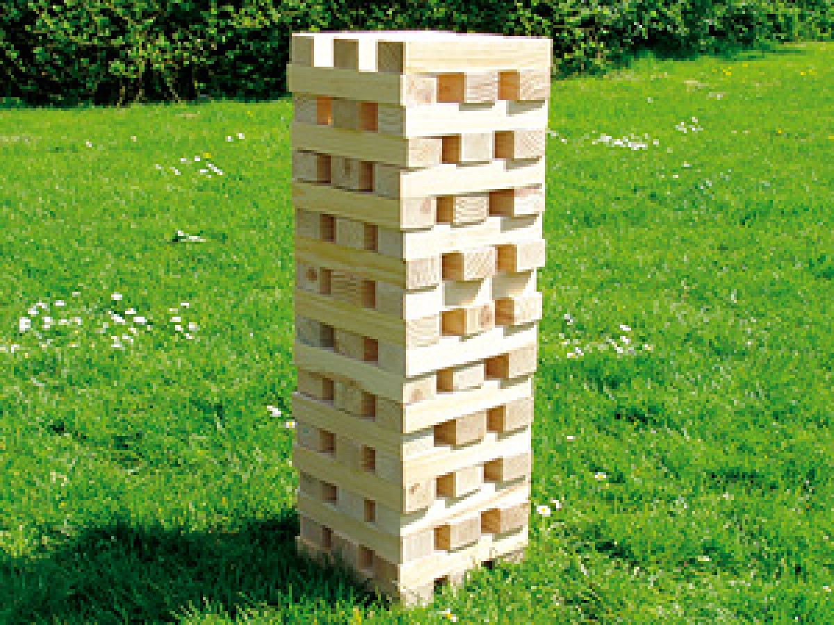 Bouw een zo hoog mogelijke toren. Schuif, trek of duw een blok uit een willekeurige laag en leg dat blok weer bovenop de toren. Dit lijkt makkelijk maar je moet er ook nog voor zorgen dat de toren overeind blijft staan. Je zult zien, hoe meer blokken er uit het onderste gedeelte verdwijnen hoe moeilijker het wordt.