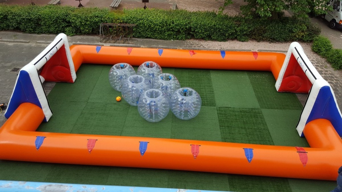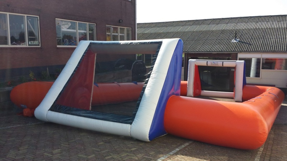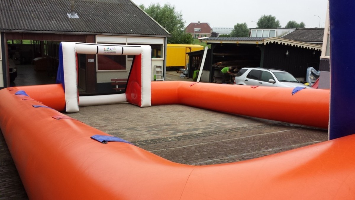 Het overbekende tafelvoetbal maar dan in levensgroot formaat. De deelnemers nemen in 2 teams van 6 personen plaats in dit opblaasbare voetbalspel en proberen een doelpunt te scoren. Dit moet echter terwijl de deelnemers vastzitten aan een harnas en daardoor niet vrij kunnen bewegen in het veld, maar alleen naar links en naar recht kunnen rennen. Samenwerking is dus van het grootste belang. Of je nu kunt voetballen of niet. Dit spel is leuk voor iedereen.