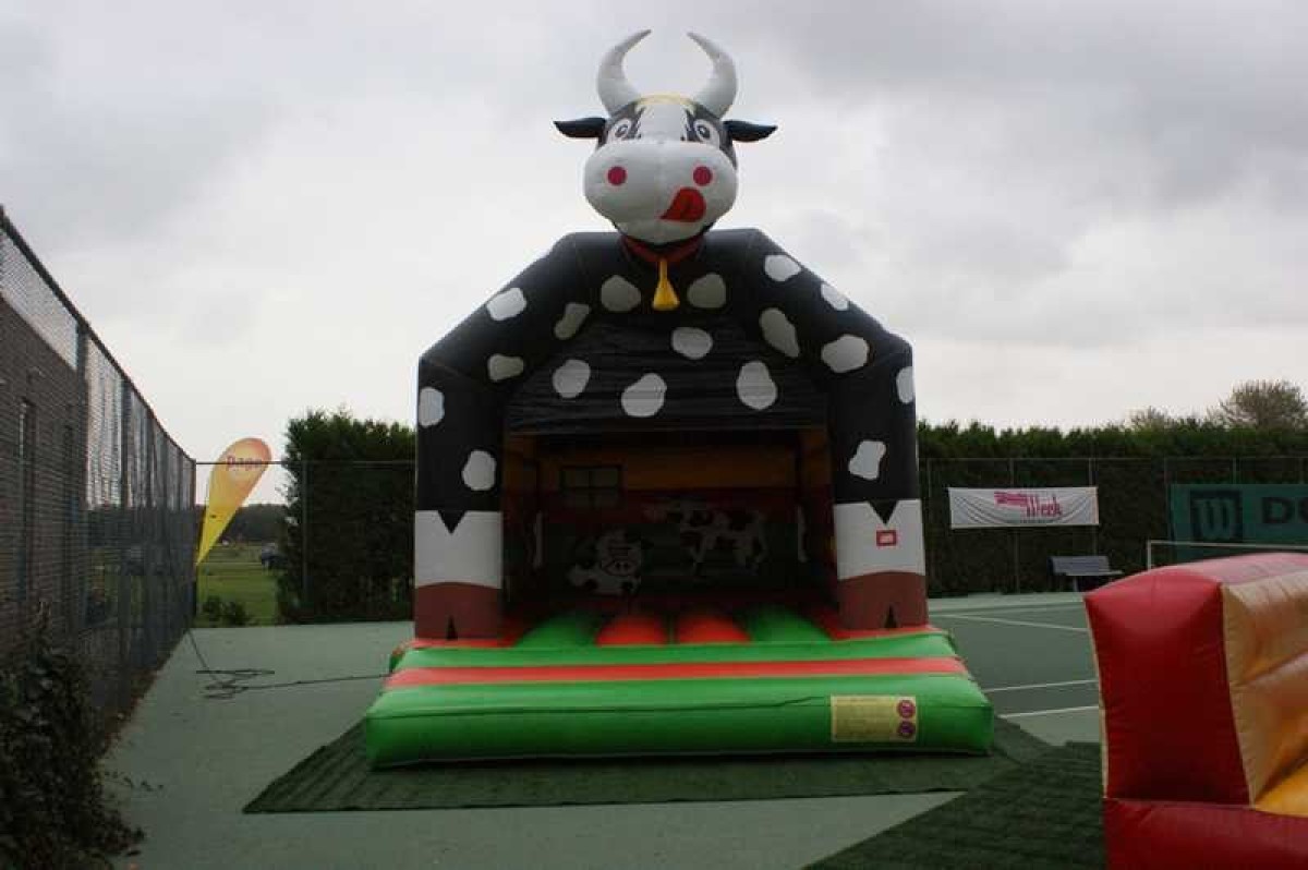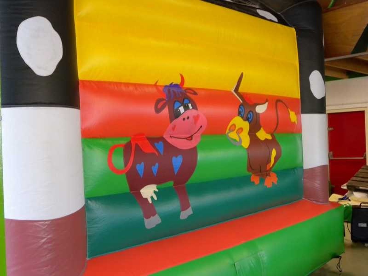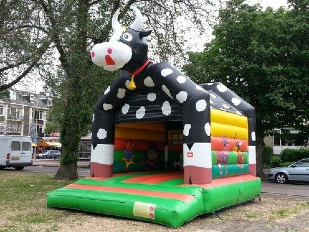Springkussen met koe print voorzien van 1 ingang aan de voorzijde. Door een makkelijk, gedeeltelijk, afneembaar dak is dit springkussen ideaal bij verschillende weersomstandigheden.