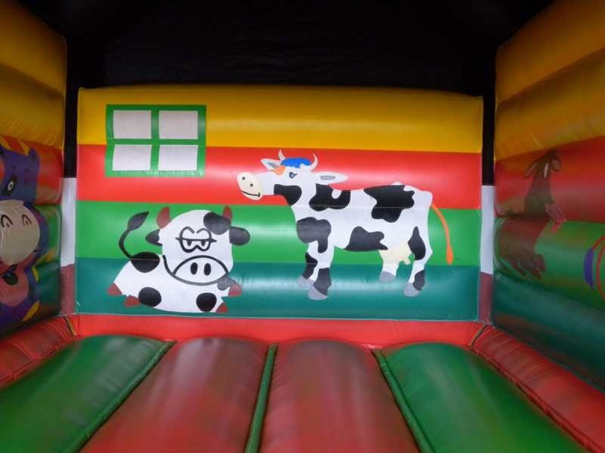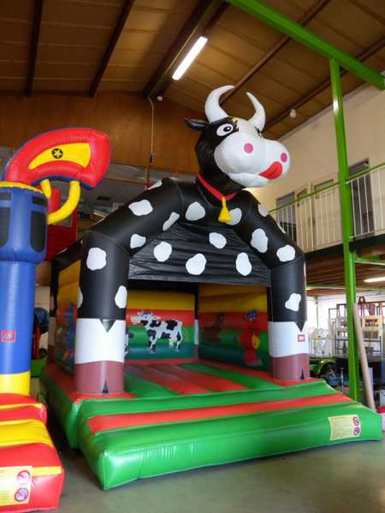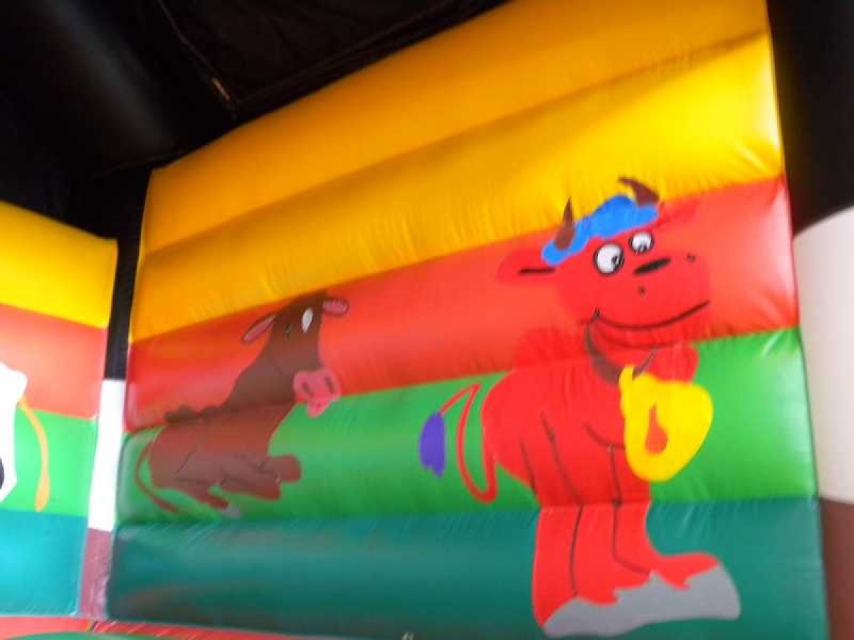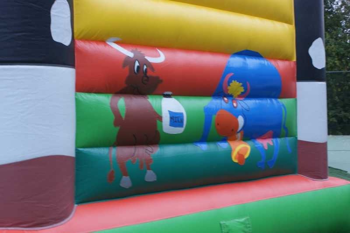 Springkussen met koe print voorzien van 1 ingang aan de voorzijde. Door een makkelijk, gedeeltelijk, afneembaar dak is dit springkussen ideaal bij verschillende weersomstandigheden.