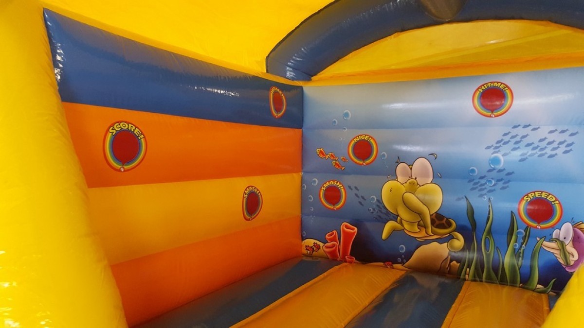 Leuk springkussentje met onderwaterfiguren. Het springkussen is overdekt en heeft 1 ingang aan de voorzijde. Zeer overzichtelijk en daarom voor bijvoorbeeld kinderdagverblijven een echte aanrader.