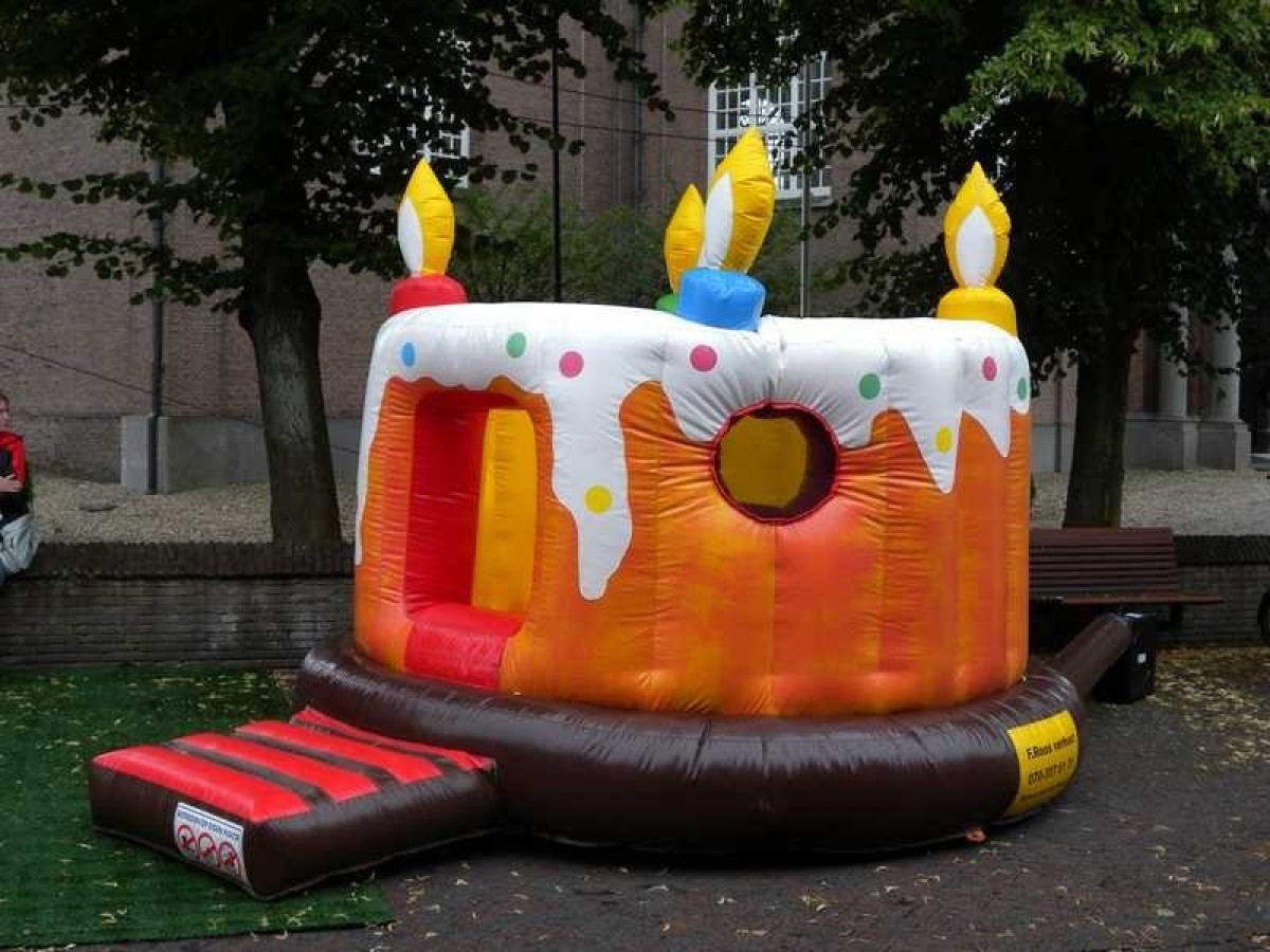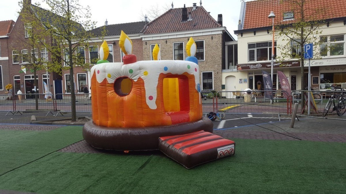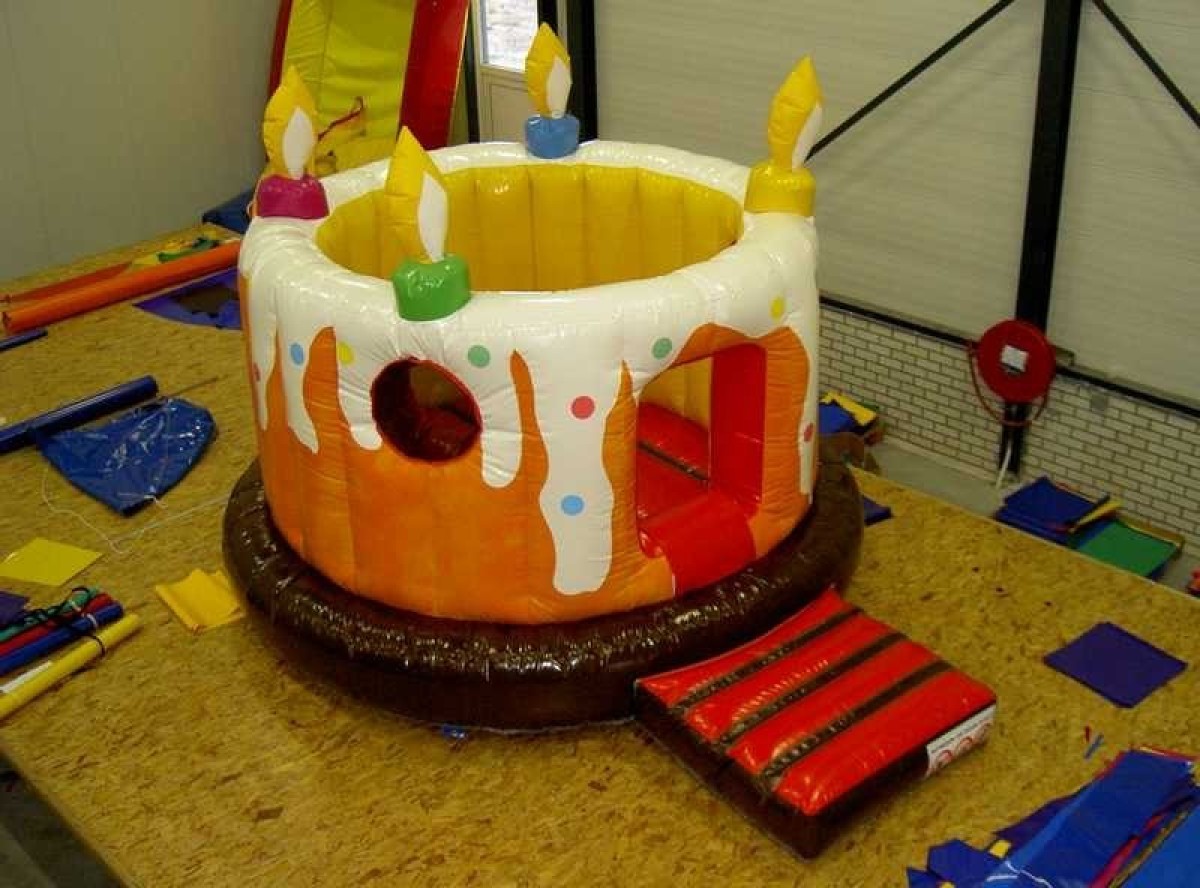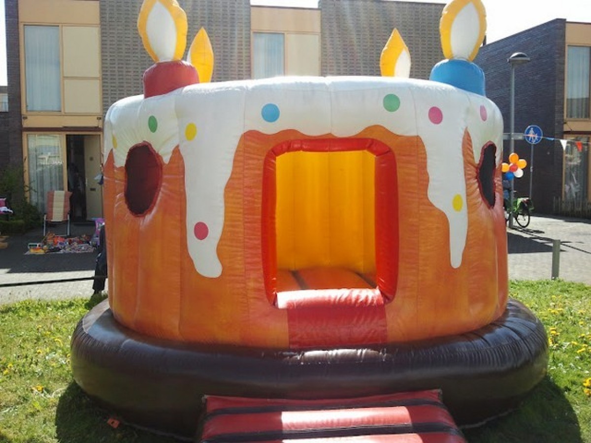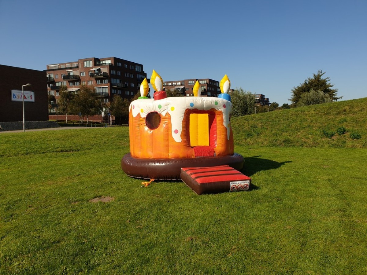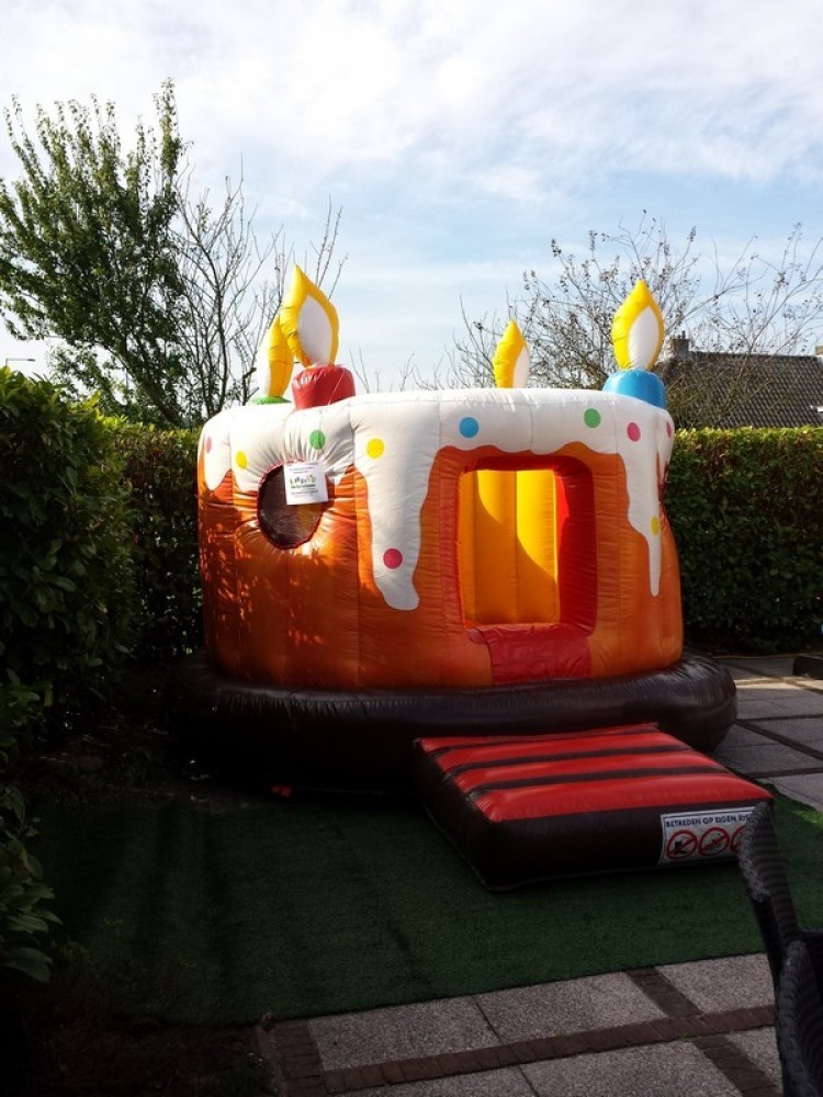 Een echt verjaardagsspringkussen waar de slagroom vanaf loopt. Het kussen is zelfs voorzien van verjaardagskaarsjes. Het enige verschil is dat je deze niet uit kunt blazen.
