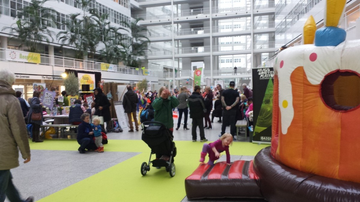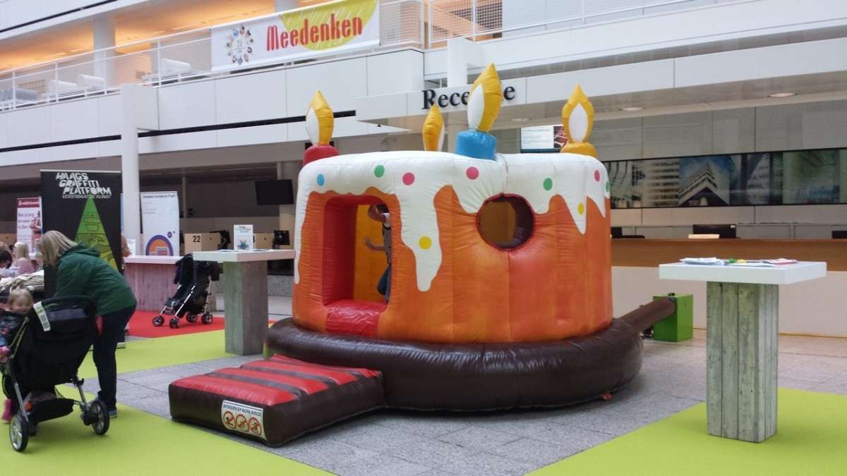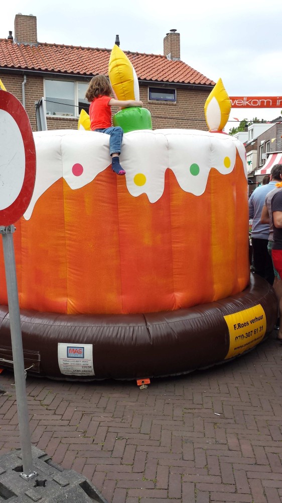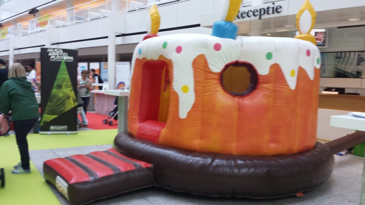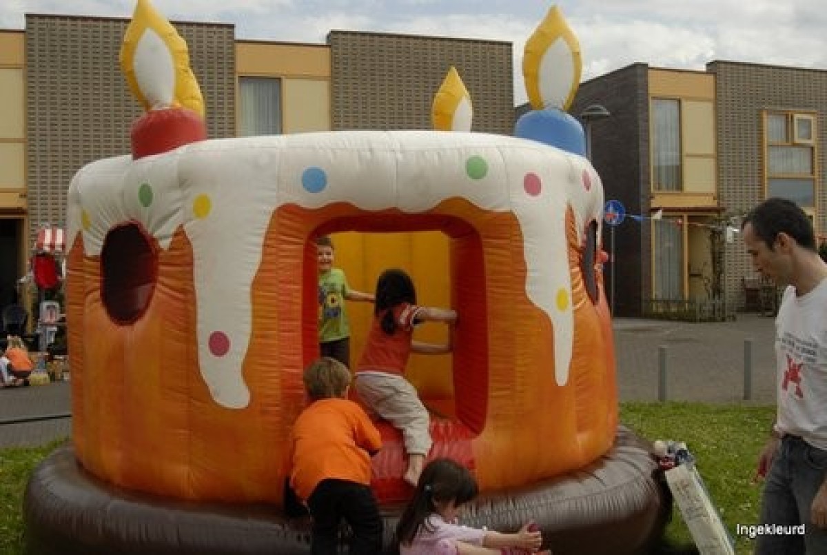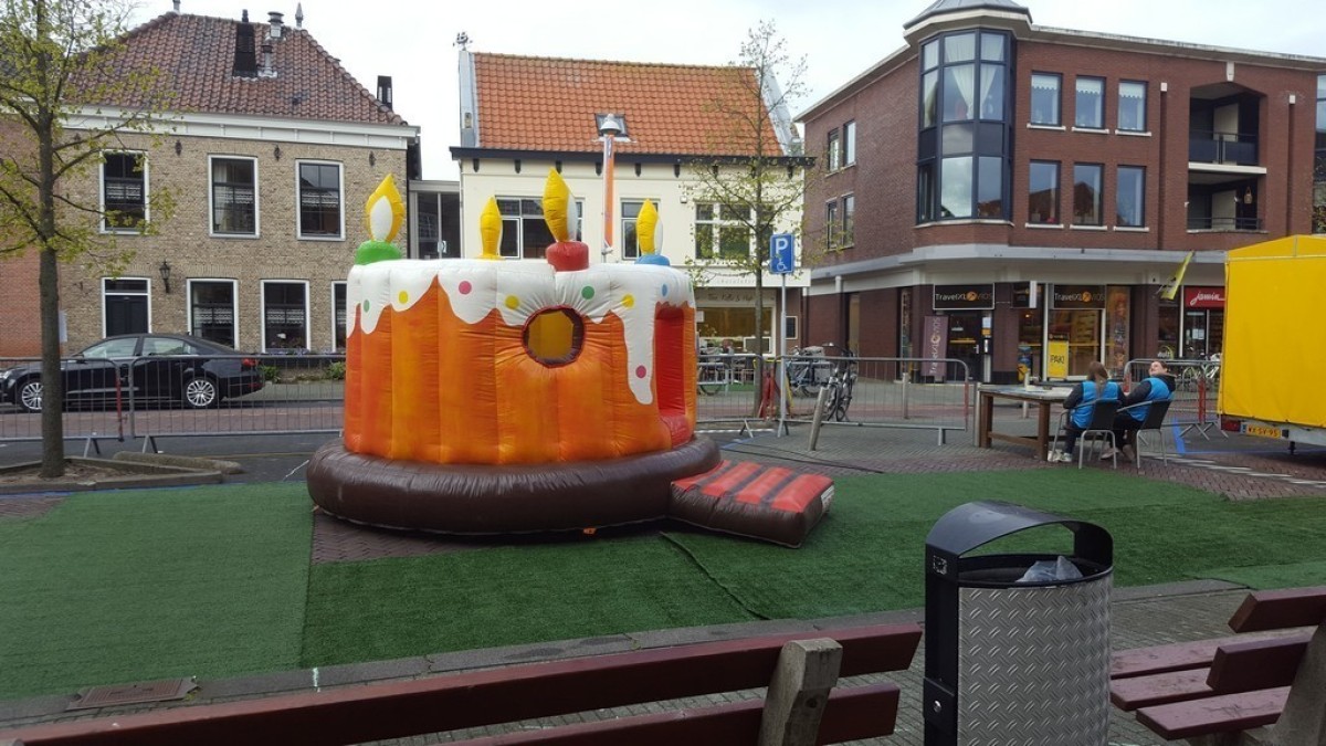 Een echt verjaardagsspringkussen waar de slagroom vanaf loopt. Het kussen is zelfs voorzien van verjaardagskaarsjes. Het enige verschil is dat je deze niet uit kunt blazen.
