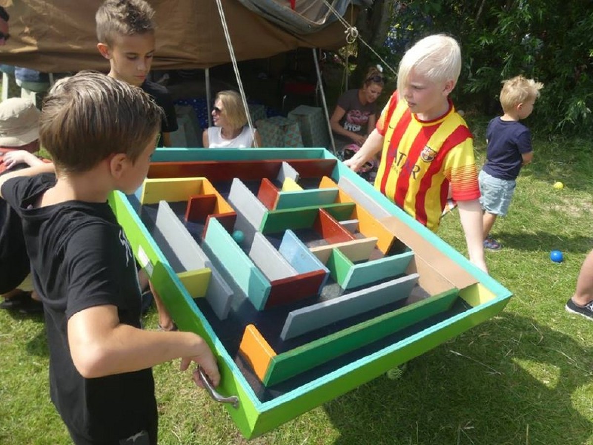 Beweeg met z’n tweeën of vieren de bal door het doolhof. Bereik zo snel mogelijk het midden. Voor de oudere kinderen kun je het spannender maken door 2 ballen te gebruiken.
