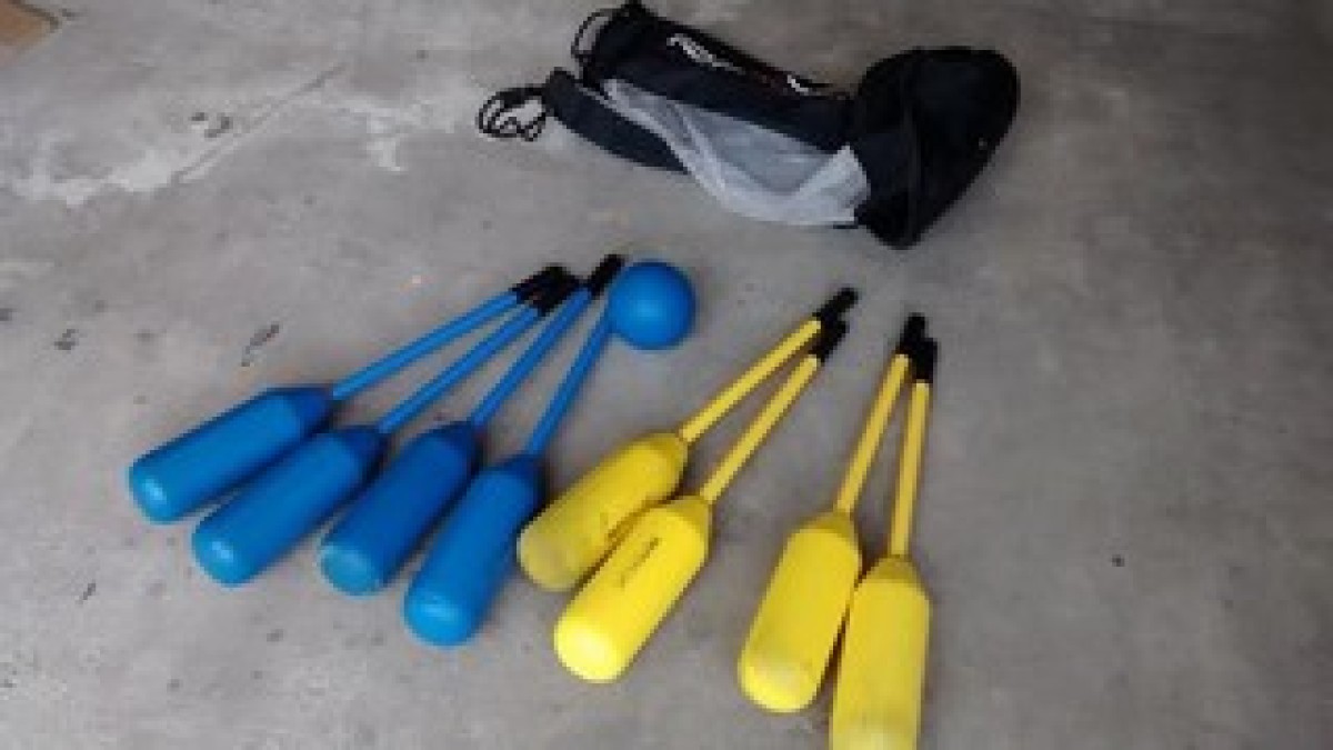 Leuke variant op het bestaande hockey: Knotshockey. Bestaande uit 6 blauwe knotsen, 6 gele knotsen en 2 ballen in tas.