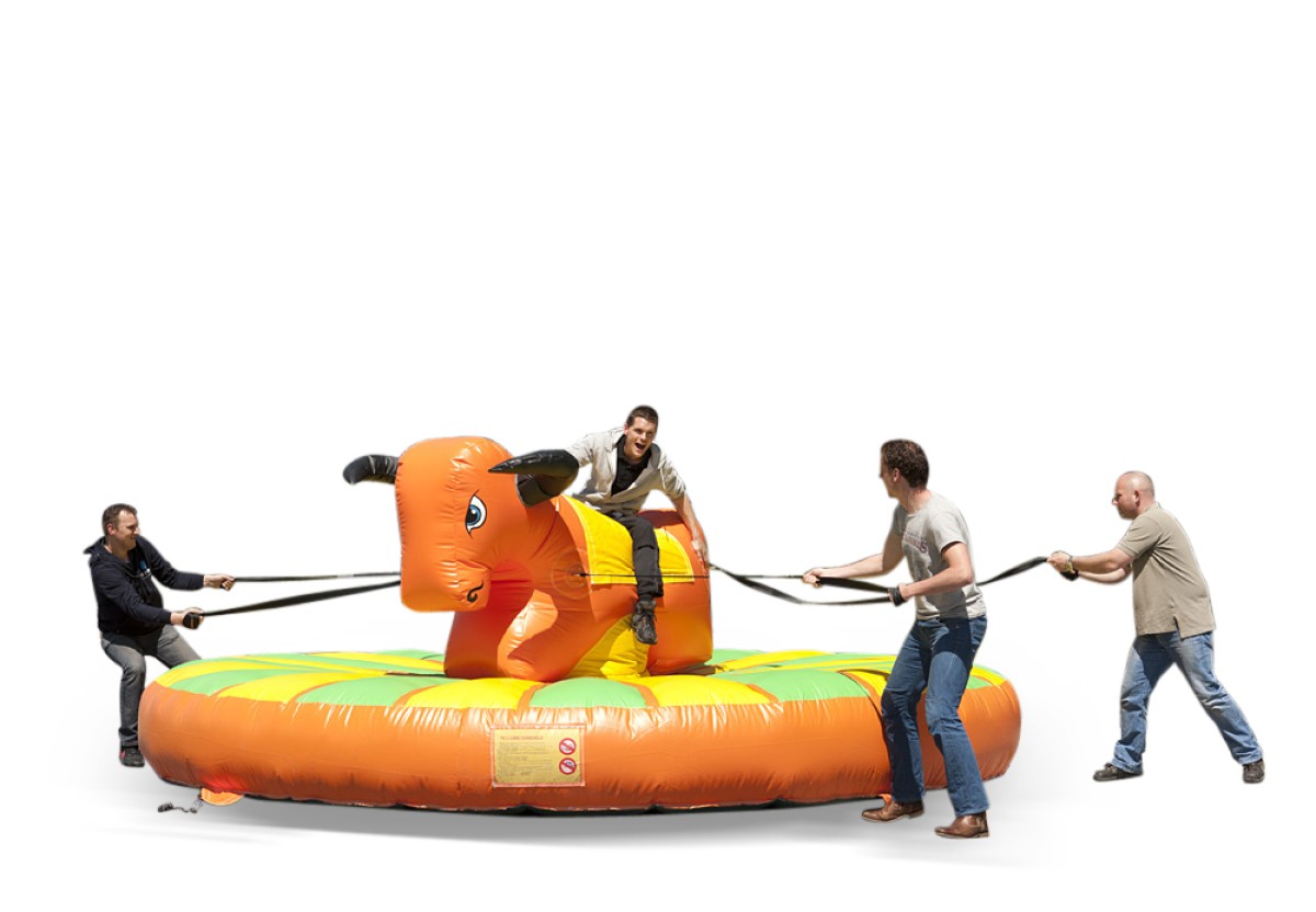 Laat 1 persoon plaatsnemen op de stier zodat 4 anderen door middel van 4 touwen aan de zijkanten kunnen proberen die persoon eraf te gooien. Wie blijft het langste zitten?