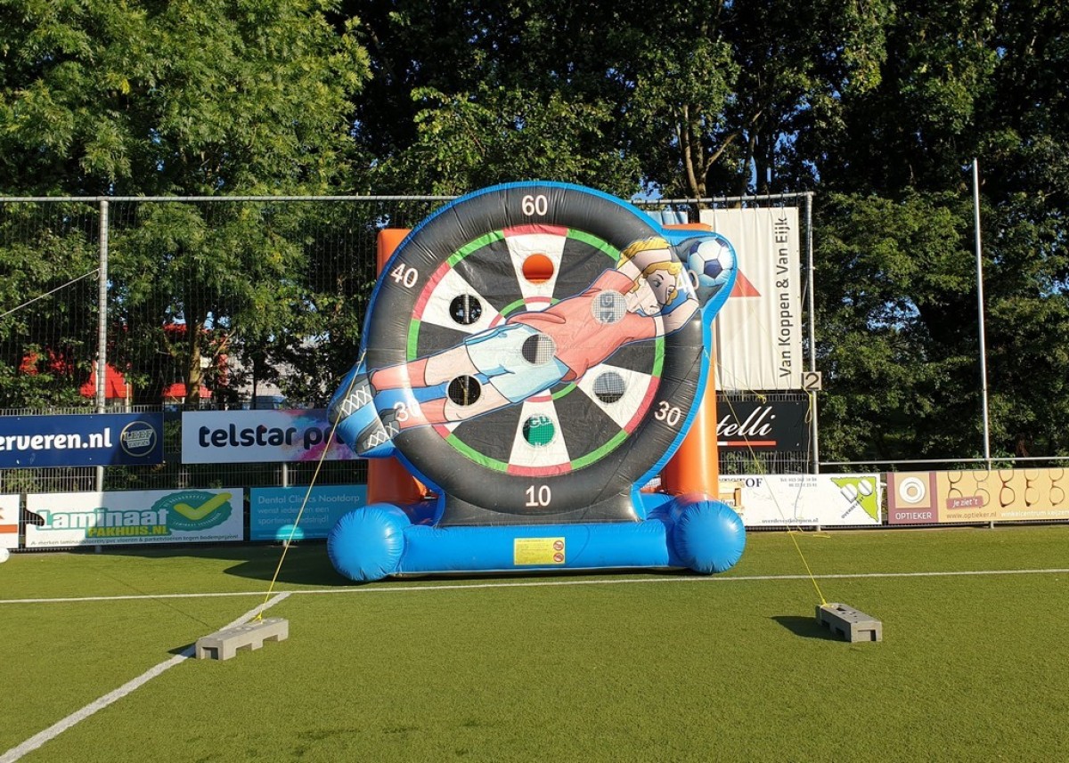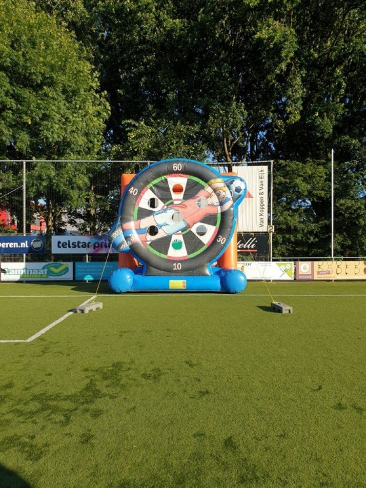 Deze te gekke voetbal schietschijf is een heuse topper op ieder feest. Schiet de bal in de 4meter hoge attractie in de vorm van een groot dartbord en schiet door 1 van de 7 gaten in het doek.